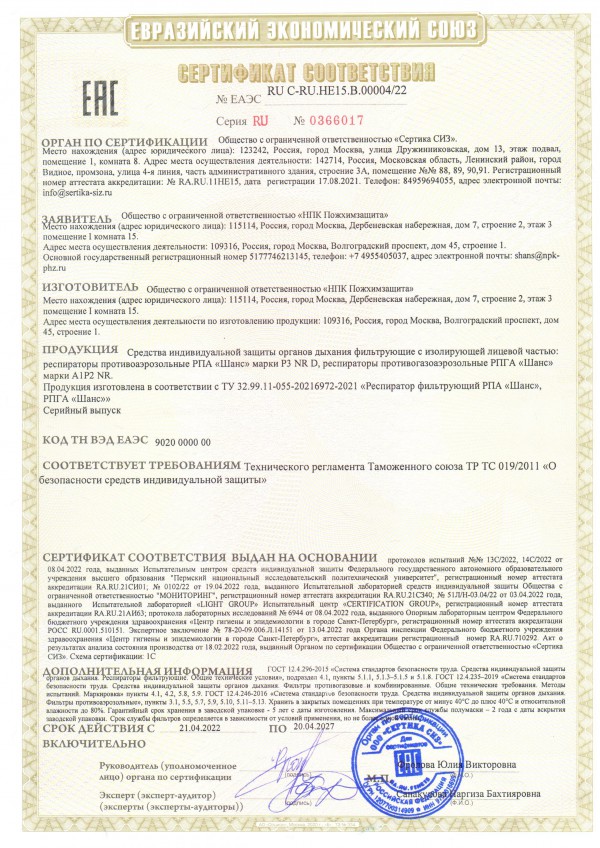 | Класс защиты | А1Р2 | ГОСТ Р 12.4.191-99 |