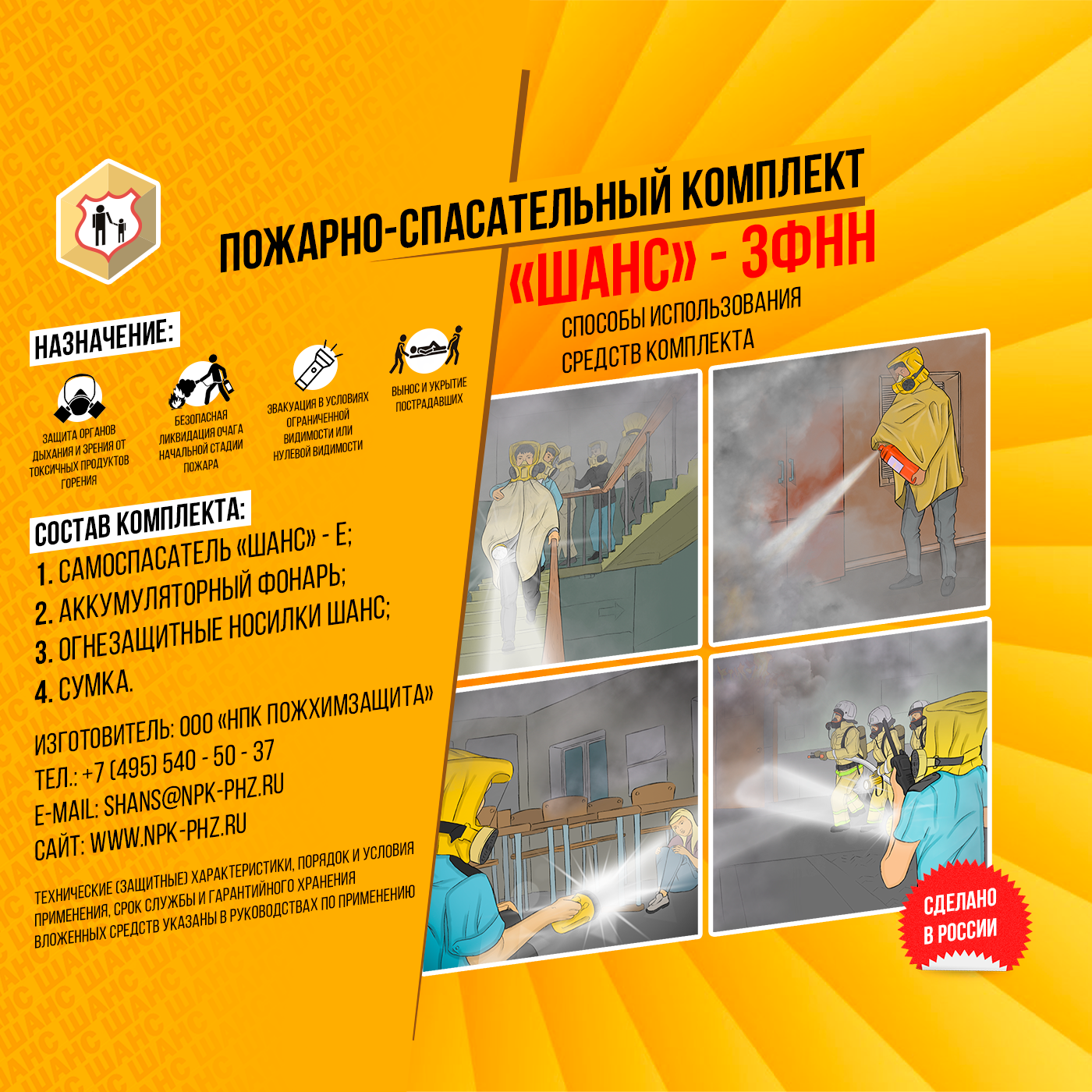 Компактно сформированный пожарно-спасательный комплект «Шанс-3ФН»Н обеспечивает удобство хранения и позволяет комплексно и максимально эффективно использовать средства индивидуальной защиты в условиях воздействия открытого пламени и сильного задымления. Рекомендуется для больниц; для домов престарелых; для гостиниц и общежитий; для объектов с ночным пребыванием людей.