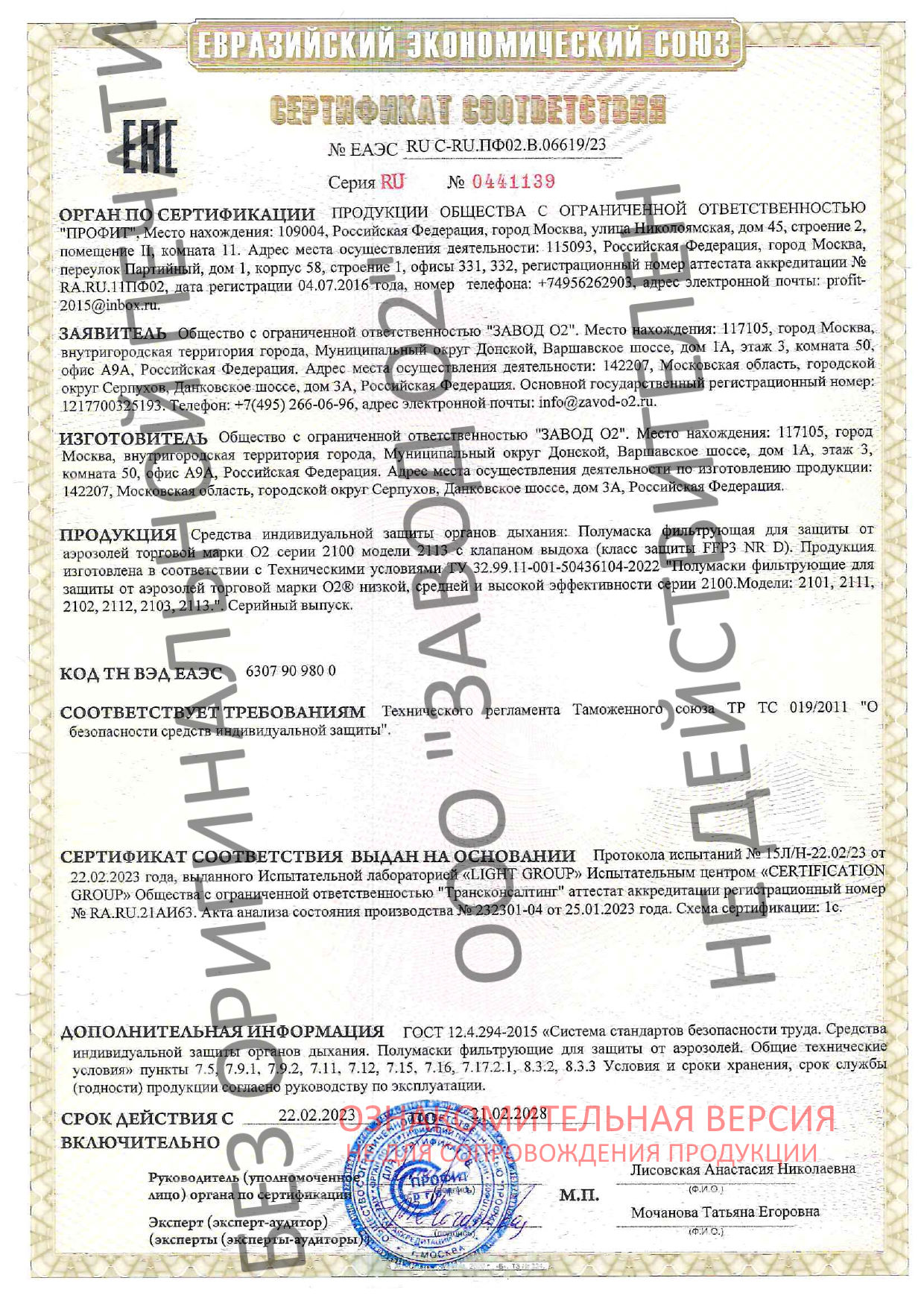 | Класс защиты | FFP3 (EN 149:2001+A1:2009), 3-й класс (ГОСТ 12.4.294-2015) |